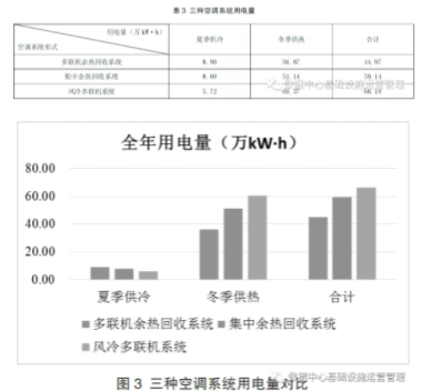 该项目冬季供热时间按11月1日至次年3月31日, 夏季供冷时间按6月15日至9月15日, 供冷工况空调运行时间按每天8小时考虑, 供热工况空调按全天运行考虑。多联机余热回收系统、集中余热回收系统、风冷多联机系统全年用电量见表3,用电量对比如图3所示,用电量未计入初期余热不足时辅助热源用电量。
