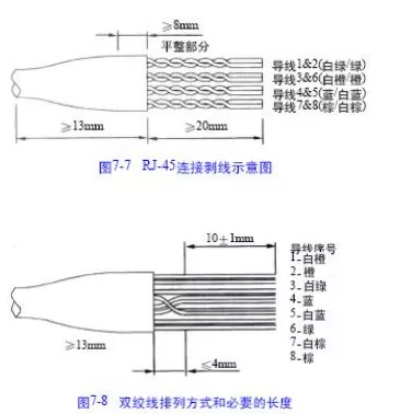 根据我们在工程中的经验,一般采用模块端接标准为 E I A / T I A 5 6 8 A 和 EIA/TIA568B 2 种方式(我们一般选用 568B 这种标 准)。