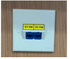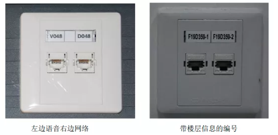 面板标签一律用标签机打成白色或黄色,字体选用微软雅黑加粗。如图:电脑和电话分别为 D 和 V 开头,或者编号前加上楼层信息(双孔面板标签标 识之间需要用线隔开),标签粘贴好后需将面板自带透明盖板覆盖在标签上: