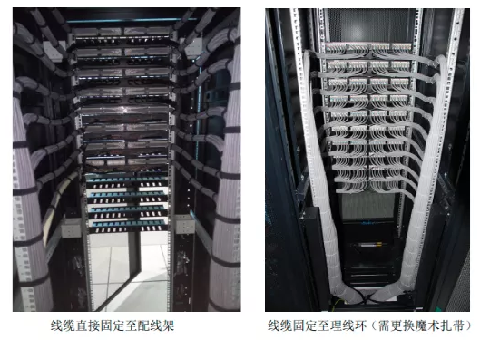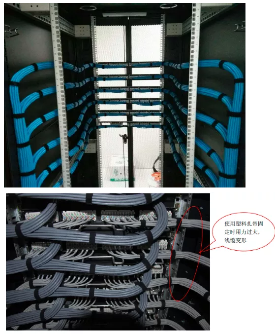 线缆需平直不得产生扭绞、打圈等现象。可以先用塑料扎带固定,待机柜整理好之 后,将塑料扎带更换为魔术扎带固定;