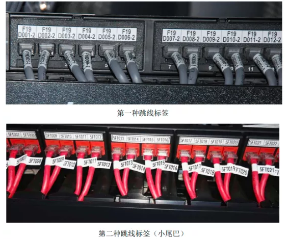 跳线标签可以选用两种方式:第一种是缠绕在跳线表面标签(采用 24 的标签 带,一圈打印 2 个编号,绕跳线一周后上下显示两个编号,还需在标签表面再 缠一层透明胶带,防止标签脱落);