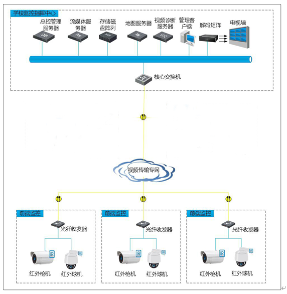考虑到项目设计的定位及数字化视频产品的成熟与发展,本设计视频监控系统采用高清网络架构,前端摄像机采用纯高清设备,传输采用基于校园局域网的网络传输、并由NVR进行本地存储,传输至中心对关键报警数据进行二次存储。系统主要对校园内各个场所包括周界围墙、出入口、主干道、办公楼、教学楼、学校活动大厅、图书馆、电梯厅及电梯等进行全方位立体式监控;录像等;