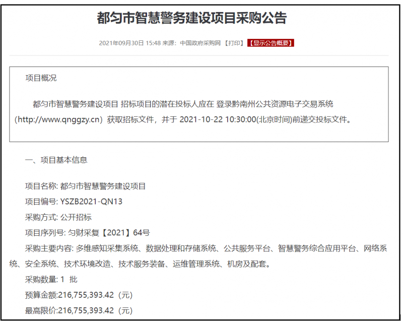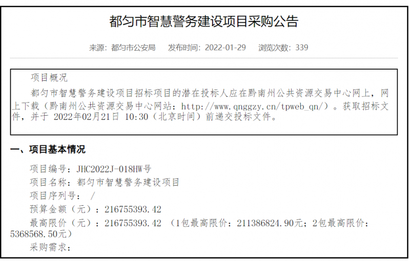 2021年9月27日;都匀市发布智慧警务建设项目采购需求公示,预算216,755,393.42元;