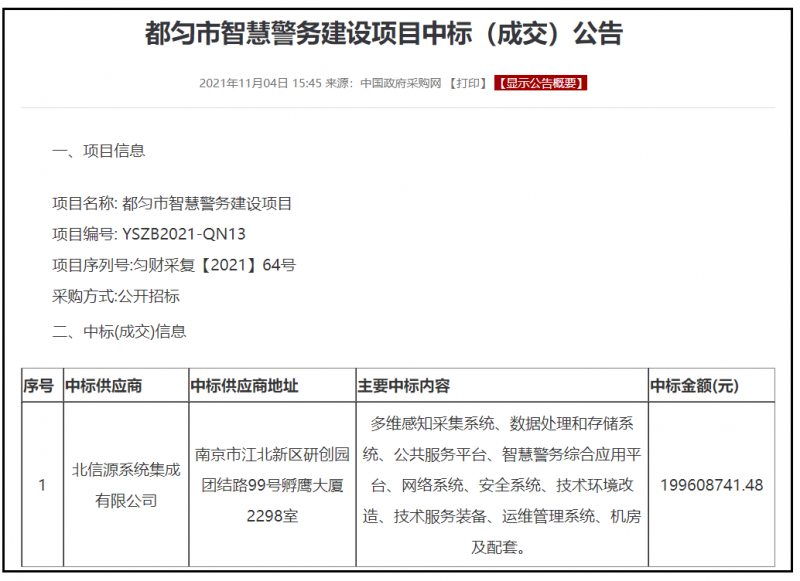 2月22日,贵州省黔南州都匀市智慧警务建设项目中标公告,