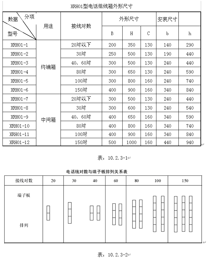 (6) 嵌入式暗装组线箱及有关技术数据见表 10.2.3-1、表10.2.3-2。