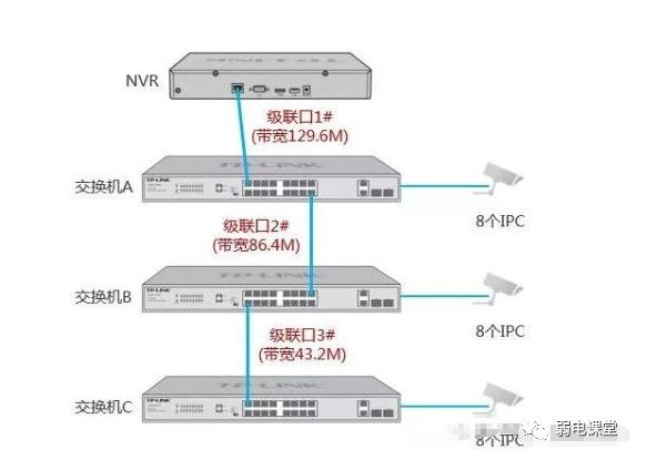 级联口3#必须满足交换机C上所有IPC产生的带宽和,带宽为(4+0.5)×120%×8=43.2M,级联口3#使用百兆口即可;