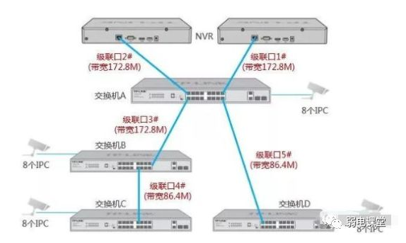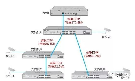 级联口4#和级联口5#带宽均为86.4M,级联口3#带宽为172.8M(被两个NVR同时取流所以带宽翻倍),都超出了70M,所以交换机B、C和D推荐使用千兆上联(千百兆混合)交换机;