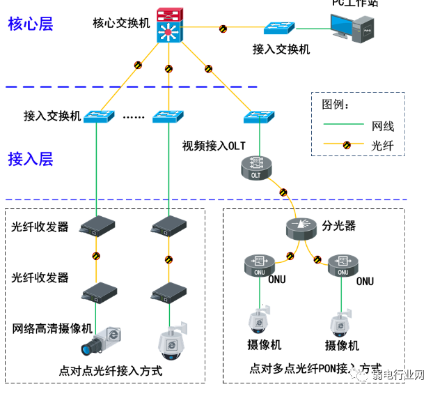 PON是一种无源光网络,和普通光纤传输有一定的区别,传统光纤传输采用双芯光纤传输,PON采用单芯光纤传输,另外PON的传输距离更远,更适合远程监控。在我们弱电VIP技术群中有讨论到相关的内容。