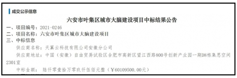 安徽省招标集团股份有限公司发布《六安市叶集区城市大脑建设项目》中标公告,供应商名称:天翼云科技有限公司安徽分公司,中标金额:¥60109500.00元。