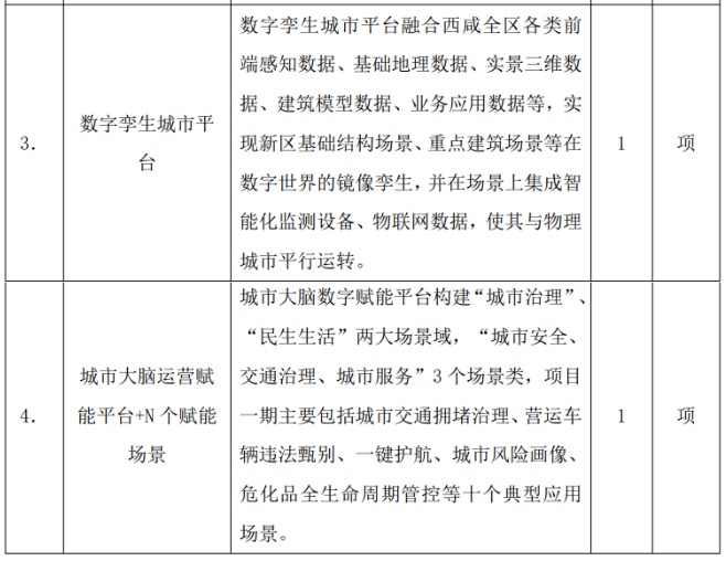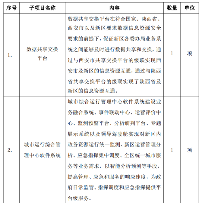 项目内容:本期为西咸新区智慧城市共性平台(一期)购买服务项目招标,招标内容包括:数据共享交换平台、城市运行综合管理中心软件系统、数字孪生城市平台及城市大脑运营赋能平台+N个赋能场景四个子项目的开发服务及运营服务(服务周期三年)。