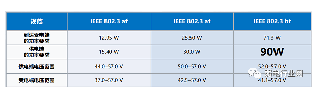 为满足PD设备对更大功率的需求,全新的 IEEE 802.3bt(也称为PoE++或4PPoE)于2018年发布,新标准对先前的 PoE 和 PoE+ 规范做了修订,可将功率水平扩展到90W。