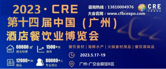 中国酒店餐饮业博览会(简称:CRE中国餐博会)是国内规模最大、影响力最强、品质最高的酒店餐饮博览会之一。将于2023年5月17-19日,广州·广交会展馆B区盛大举办!由广东省餐饮服务行业协会与广东省团餐配送行业协会共同主办。本届展会规模达6,0000㎡、预计吸引8,0000+专业观众、1500+知名品牌、有1,2000种产品展示、30+场同期论坛赛事活动。CRE中国餐博会整合餐饮全产业链优势资源,将大力推动餐饮业上中下游,迎合中国酒店餐饮业高速增长、满足业界不同领域业务需求而打造的全产业链、全渠道整合、高效交流平台,聚力打造2023华南餐饮业年度盛会,共同开拓中国餐饮业市场蓝海,为全国餐饮业发展注入强劲新动能!