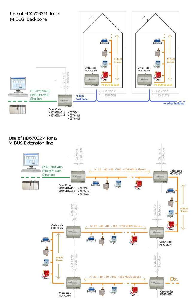 HD67032M中继器可隔离或延伸M-Bus网络并可最多连接250个M-Bus从设备。