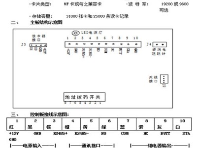 1、系统卡的制作:先断电,将模块拨为0号地址,然后加电(蜂鸣器长鸣一声),此后读的一张卡为初始化卡(蜂鸣器短鸣一声),第二张卡为登入卡(蜂鸣器短鸣两声),第三张卡为删除卡(蜂鸣器短鸣三声)。注意:系统卡制作完后,断电将地址码恢复成1号或以上地址,否则重新加电后将会重新制作系统卡;