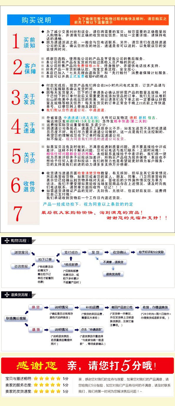 一个星期产品保修说明:货品签收后,一个星期内产品质量问题,我公司为顾客您:承担返修件的来回运费。物品发回来的运费请顾客您先垫上,(不接受运费到付,敬请留意)