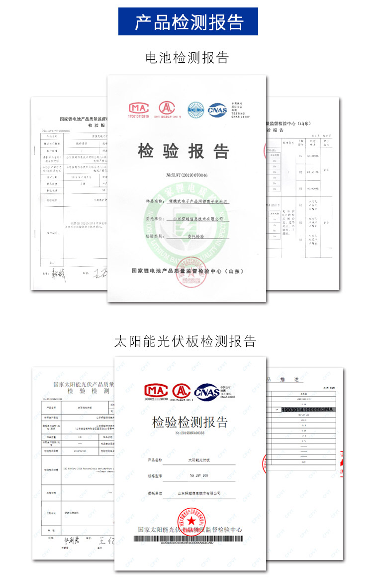 6、 太阳能电池板采用TUV认证标准电池板、蓄电池采用三元动力锂电池
