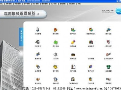维新房地产售楼系统:针对房地产公司的实际情况开发。软件功能涵盖房地产企业楼盘销售工作的全过程,包括前期资料准备对房源、对价格、对付款方式的管理;销售业务中对排号、小订、大定、签约、退房、换房、二次交易的处理,销售以后对客户收款、退款及客户服务管理等。主要功能模块有:房产资料、销售管理、手机查询销售子系统、财务管理、客户管理、辅助管理、统计报表、基础数据、系统管理。软件实用性强,操作灵活、简便,与任何财务软件都可以进行数据倒入。并可以根据用户的要求进行个性化修改。这段时间我公司的维新房地产销售管理软件、电脑摇号软件,在搞20周年庆优惠活动,如你公司需要使用管理软件,我们可具体详细商谈