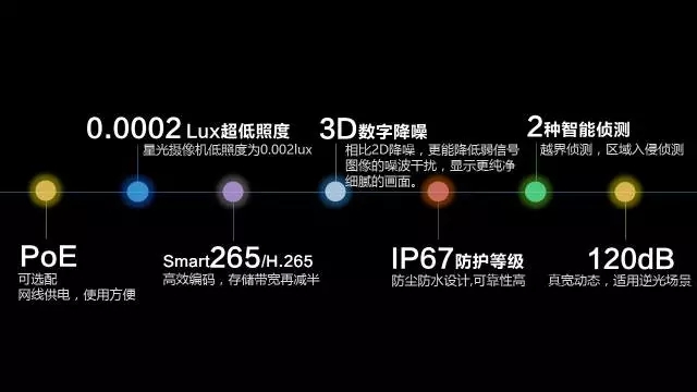 即使在微光环境也能呈现彩**像,且在光照极低或无光环境,摄像机自动采用暖光补光,真正实现在人眼几乎完全看不见的情况下,实时拍摄到全彩动态图像。