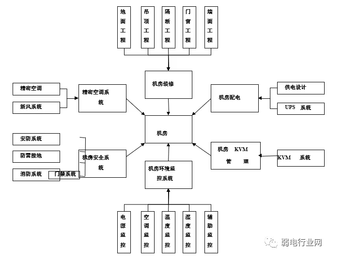 机房设计要求能够通过TCP/IP网络、RS232/RS485等媒介实现对中心机房、分散于不同地域的机房等场地内的动力环境设备进行有效的集中监控,监控对象范围为动力设备、专用精密空调、室内空气质量检测、低压配电柜、新风机、环境系统(温湿度检测、地面漏水检测报警、照明)、UPS等。