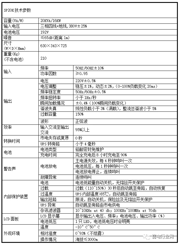 本次机房的UPS电源要求为国际知名品牌,功率为20KVA/16KW满负载载延时2小时一套。