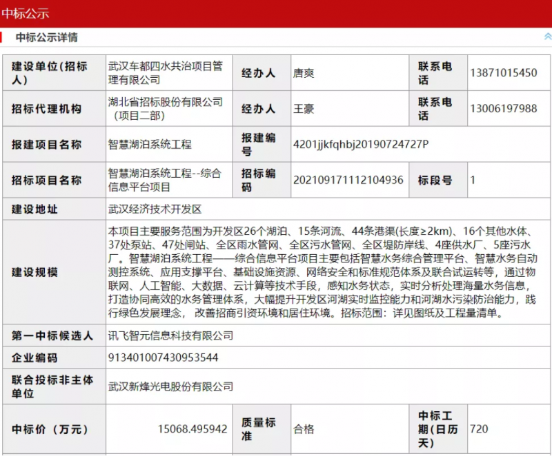 11月25日,武汉经济技术开发区智慧湖泊系统工程--综合信息平台项目中标公示,第一中标候选人:讯飞智元信息科技有限公司/武汉新