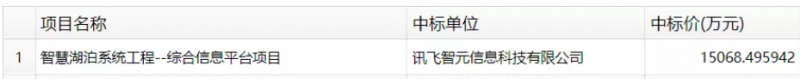 11月25日,武汉经济技术开发区智慧湖泊系统工程--综合信息平台项目中标公示,第一中标候选人:讯飞智元信息科技有限公司/武汉新烽光电股份有限公司,中标金额:15068.495942万元。