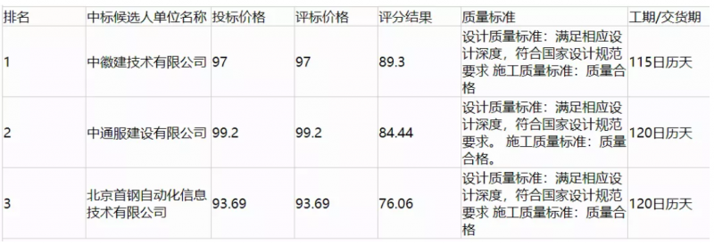 全部投标人名称:中徽建技术有限公司、中通服建设有限公司、北京首钢自动化信息技术有限公司、中憬科技集团有限公司、连云港杰瑞电子有限公司。