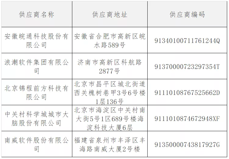 入围供应商:安徽皖通科技股份有限公司、浪潮软件集团有限公司、北京锦程前方科技有限公司、中关村科学城城市大脑股份有限公司、南威软件股份有限公司