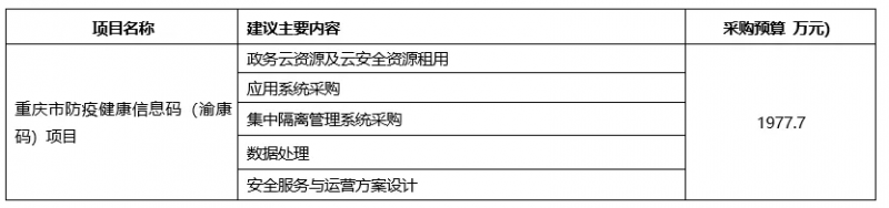 12月14日,重庆市防疫健康信息码(渝康码)项目公开招标公告,预算金额:19,777,000.00元。