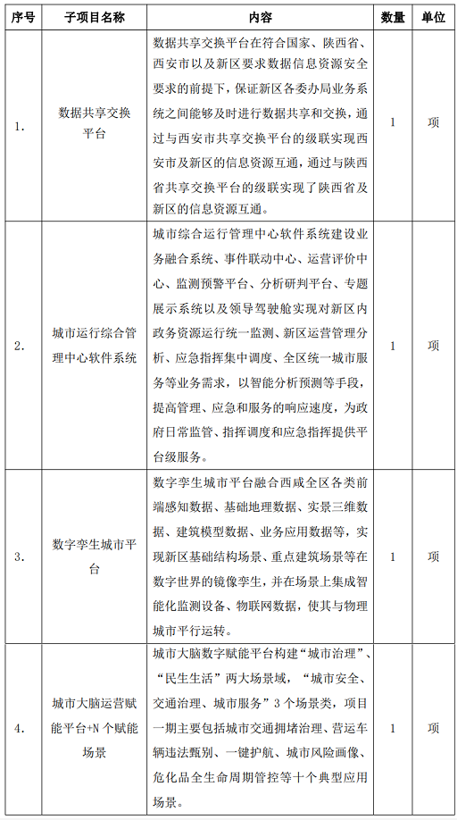 项目内容:本期为西咸新区智慧城市共性平台(一期)购买服务项目招标,招标内容包括:数据共享交换平台、城市运行综合管理中心软件系统、数字孪生城市平台及城市大脑运营赋能平台+N个赋能场景四个子项目的开发服务及运营服务(服务周期三年)。
