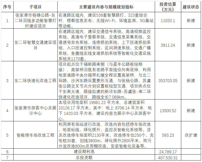 项目概况:本项目建设内容包括张家港市杨锦公路-东二环沿线多功能智慧灯杆建设项目、东二环智慧交通建设项目、东二环快速化改造工程、智能停车场改造工程、张家港市游客中心及展示中心五个子项目。各子项工程内容、规模及工程费用等详见表1-1《项目建设主要内容与规模规划指标一览表》。
