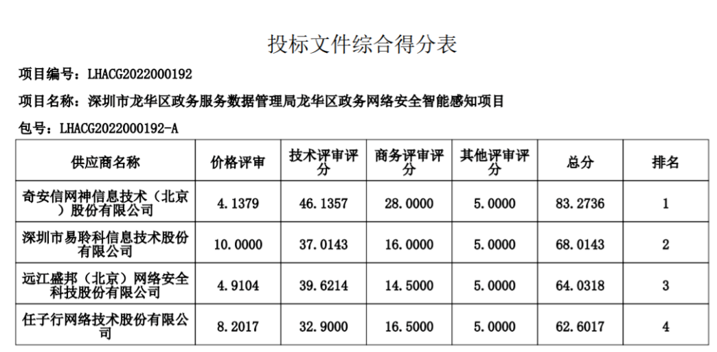 2022年7月6日,深圳市龙华区政务服务数据管理局龙华区政务网络安全智能感知项目成交公告,供应商名称:奇安信网神信息技术(北京)股份有限公司,中标(成交)金额:14,500,000.00元。