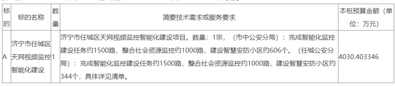 项目编号:SDGP370811202102000152 项目名称:济宁市任城区天网视频监控智能化建设项目 预算金额:4030.403346万元 最高限价:4030.403346万元 采购需求: